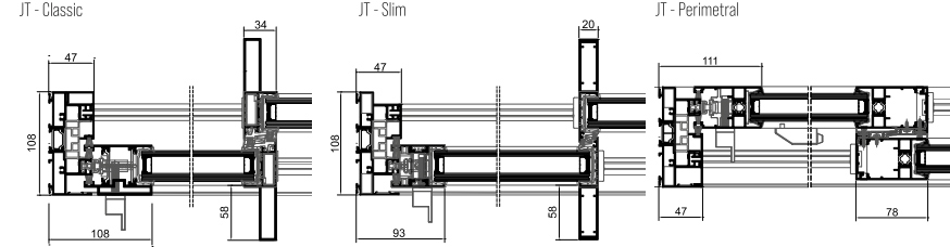 Versartile, robust and safesystem which allows its application in larger frames, compatible with 2 to 6 sashes typologies, in 2 or 3 rails systems and smaller aluminum views, this system with thermal break aims to bring an answer to current architectural trends. Now we also have the JT-Perimetral System.